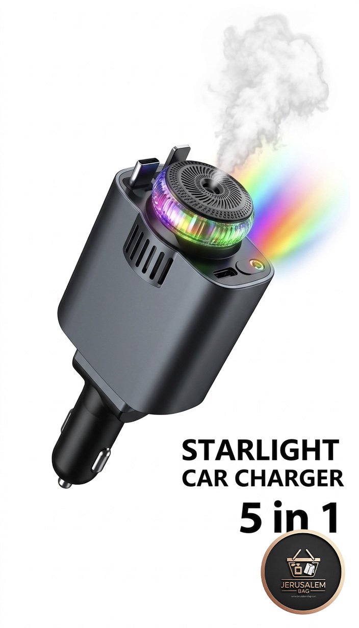 تصميم 5 في 1: جهاز واحد يقوم بمهام متعددة (شحن، تعطير، إضاءة، وأكثر) ليوفر عليك زحمة الأسلاك والأجهزة.